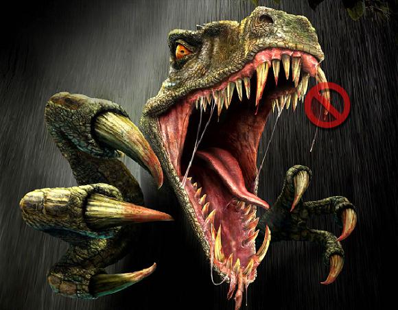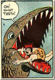 圖一中的這只尖牙利爪目露兇光,稱A。圖二中這只同樣血盆大口但目光可愛仿佛因吃驚才長大了嘴巴的,稱B。雖然A風(fēng)格細膩,生動傳神,貌似很逼真,但是那兩對長長的“獠牙”卻是犯了想當(dāng)然的錯誤。哺乳動物里的獵手門都有尖長致命的犬齒,其中最深入人心的當(dāng)屬劍齒虎,他上頜的那兩把利刃可謂犬齒的極致,但是在遙遠的侏羅紀,恐龍并沒有如此專事獵殺的牙齒。將今論古是需要保持謹慎的。事實上食肉類恐龍的牙齒正如漫畫B中所示:匕首狀,前后大小基本一致,而又參差不齊。