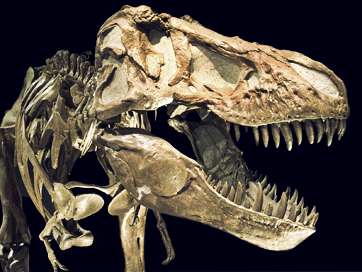 從這張霸王龍的頭部特寫中,我們可以看出:他的所有牙齒形狀相同,長短不一,排列并不緊密。這正是吃肉的獸腳類恐龍的典型特征。與哺乳動物相比,恐龍的牙齒為終生生長的同型齒。我們都很熟悉的門牙虎牙和磨牙,在恐龍還沒有分化,滿口的牙都長得一個樣子,叫同型齒。而后來的哺乳動物有門齒犬齒和臼齒,稱異型齒。我們的牙齒有兩套,幼時是無根的乳齒,后來被恒齒替代,而恒齒脫落后是不能再長出的。而在恐龍牙齒是終生生長的,不是像老鼠的門牙那樣不停的長,而是一直進行新舊更替,這就是為什么這張照片上的牙齒明顯大小不一,剛露頭的牙齒是正在長出。