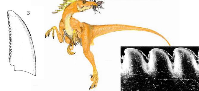 由于時代久遠,這些迷人的生物給我們留下的可供研究的痕跡并不多,保存完整的骨架就更是少之又少。而牙齒因為相對較小,質(zhì)地堅硬,表面還有釉質(zhì)保護,易于保存。所以牙齒化石就成為最常見的恐龍遺跡。隨著恐龍學(xué)家們對牙齒研究的深入,已能通過牙齒鑒別出恐龍的大致種類。1990年,加拿大艾伯塔省的Philip Currie 就利用牙齒鋸齒的形態(tài)特征的變化將當(dāng)?shù)厣钤谕戆讏资?nbsp;(Late Cretaceous)的獸腳類的恐龍分為四大類:馳龍(Dromaeosaurinae):大名鼎鼎的恐爪龍就屬于這一類;伶盜龍(Velociraptorinae);傷齒龍(Toodontidae);暴龍(Tyrannosauridae).