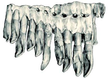 這些形狀各異的牙齒是怎樣工作的,要解決這個復(fù)雜問題,遠比推斷肉食恐龍難得多。因為他們跟現(xiàn)今的素食動物的牙齒實在相差太遠。這些有著明顯磨痕的牙齒可以進行原始的咀嚼嗎?各種答案中唯一可以肯定的是:如果他們能在一定程度上嚼碎樹葉,整個過程也是僅限于垂直方向。因為關(guān)節(jié)的構(gòu)造說明了下頜無法在水平方向上運動。而且牙齒上的磨蝕面也證明了這一點。如果你認真觀察牛羊吃草或者反芻,會發(fā)現(xiàn)他的下頜左右晃動的很厲害。正是這種運動,配合臼齒寬大多嵴的咀嚼面,把草料充分磨碎。雖然近來的研究發(fā)現(xiàn)有些進步的鳥腳類(禽龍和鴨嘴龍類)已經(jīng)演化出比較進步的取食機制,也可以上下頜橫向移動,雖然沒有幅度那么大。咬合時,上頜斜向外,下頜斜向內(nèi),產(chǎn)生原始的“咀嚼”,但大多數(shù)恐龍只能用大量的牙齒上下相對的擠壓切割,把枝葉咬碎。