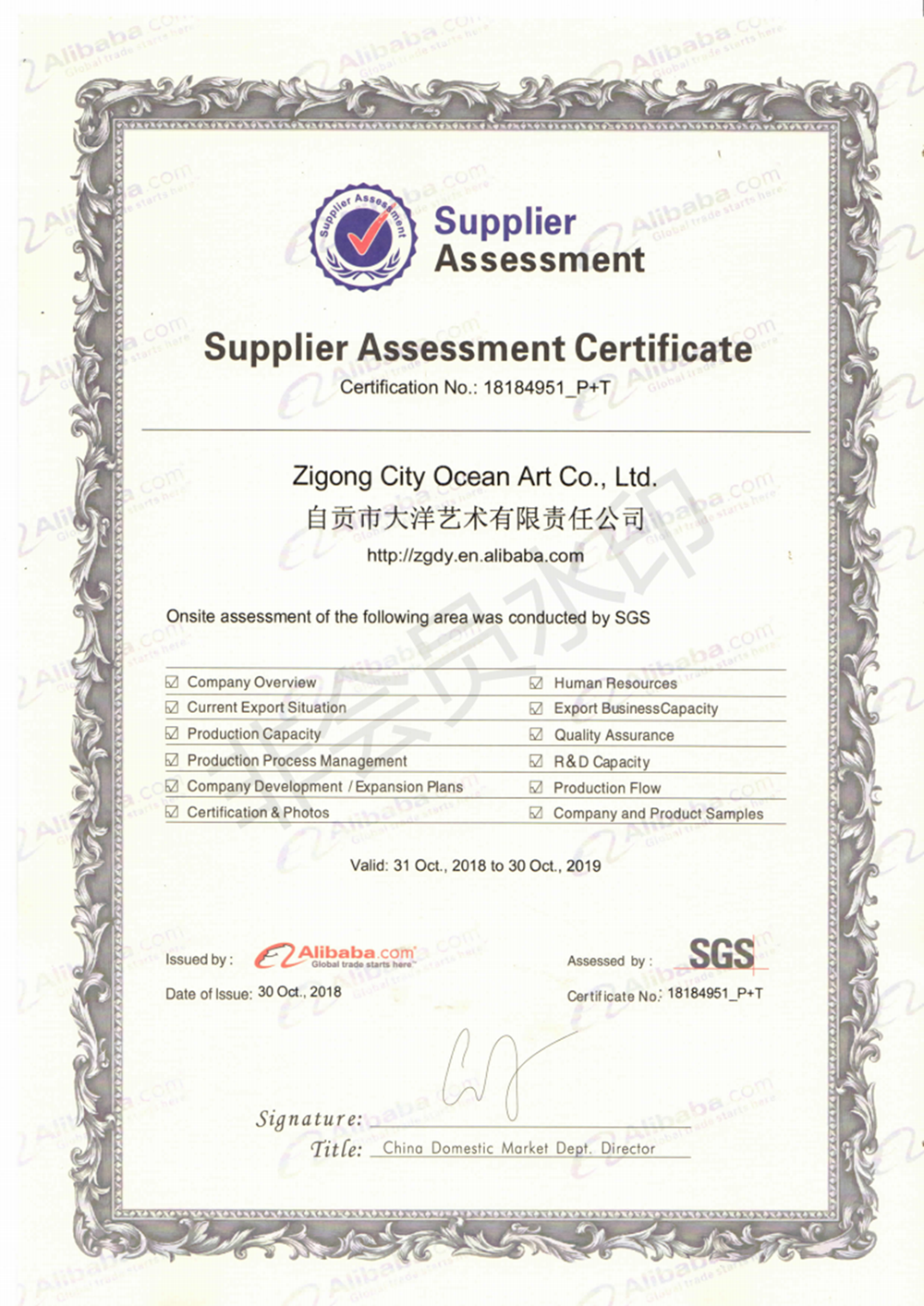 大洋藝術(shù)獲得SGS認證證書