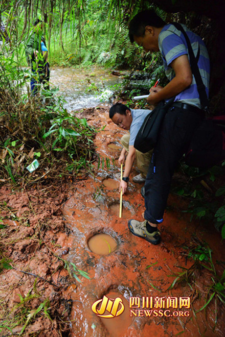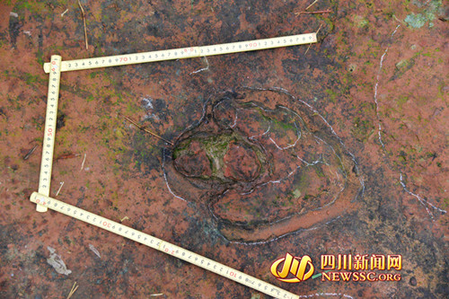 隨后,專家組對(duì)大石鄉(xiāng)新陽村桫欏溝恐龍足跡進(jìn)行考擦,龍井和新陽兩地相距直線距離約1500米。繼上次發(fā)現(xiàn)獸腳類恐龍的巖石上,再次發(fā)現(xiàn)蜥腳類恐龍?!斑@里保存著極好的獸腳類恐龍行跡。”獸腳類恐龍是一種兇猛的肉食性恐龍,是當(dāng)?shù)匕l(fā)現(xiàn)的蜥腳類足跡和鳥腳類足跡的造跡者的天敵。從足跡可推斷獸腳類恐龍長約4-6米。生活年代在白堊紀(jì)時(shí)期,距今約一億年。