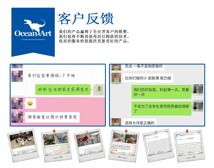 備注:我們注重展覽和產品本身的文化底蘊及科技含量,并且關注產品與觀眾的互動性、娛樂性和參與性,因此,我們先后推出了騎乘恐龍、打斗恐龍組、生蛋龍、蓋章恐龍、恐龍衣服等一系列,科技含量高,故事情節(jié)豐富,娛樂參與性極強的產品,深受廣大消費者的青睞。除了產品的研發(fā)與制造,公司的營銷核心是一套成熟的、創(chuàng)新性的展覽理念,并在海內外都取得了廣泛的成功!