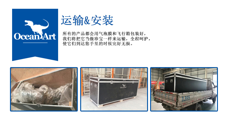 1.人控恐龍分為藏腿或露腿兩種設計,服裝長約4米,重20千克。藏腿恐龍服在腿和腹部處有一條拉鏈,當操作者穿好后,拉上拉鏈便可完全遮住身影;露腿恐龍服則會把操作者雙腿露在外面。尾部有一條可抽出的長桿,便于裝箱運輸。另外,我們會提供一個支撐架,方便擺放恐龍服裝。
